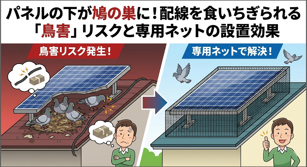 パネルの下が鳩の巣に!配線を食いちぎられる「鳥害」リスクと専用ネットの設置効果