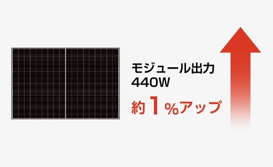 - N型高効率セル採用により、従来機種※とモジュールサイズそのままで出力が大幅にアップ。